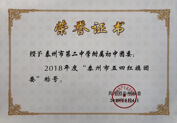 近日,从共青团泰州市委传来喜讯,泰州二附中团委被授予2018年度“泰州市五四红旗团委”称号。