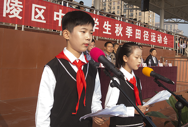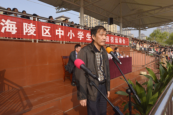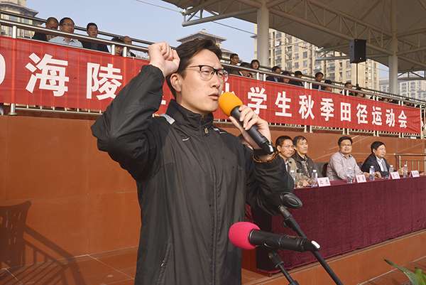 随后,姜凌致开幕词,运动员代表、裁判员代表宣誓。姜凌向本届田径运动会的召开表示祝贺,向为筹备这次盛会付出辛勤劳动的工作人员表示衷心的感谢,向参加这次盛会的全体运动员、裁判员和工作人员表示问候!他说,近年来,在海陵区委、区政府的高度重视和大力支持下,教育系统以“教育品质提升、教学质量提升、教师素质提升”为总目标,坚持全面育人、特色育人的理念,切实加强学校体育教学工作,深入推进“阳光体育”活动,学生参与体育锻炼的意识明显增强,学校体育教学水平显著提高,学生的身体素质进一步提升,有力地支持了学校德育、智育的发展。中小学生田径运动会是体现全面实施素质教育、坚持全方位育人的一次盛会,是促进全民健身运动的一次盛会,是展示各校办学理念和师生精神风貌的一次盛会。他用奥运之父顾拜旦的经典名言激励大家:“奥运最重要的不是胜利,而是参与。对于人生来说,最重要的不是凯旋,而是战斗。”他希望,全体运动员充分发扬“更高、更快、更强”的体育精神,顽强拼搏,尊重对手,服从裁判,赛出水平,赛出风格;希望全体裁判员和工作人员公正评判,热情服务,优质高效地完成各项工作;希望各校加强交流,增进友谊、展示风貌,一同把运动会办成安全有序、团结高效的盛会,为海陵教育的优质发展作出新的、更大的贡献!