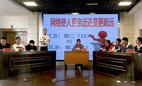 今年的辩题是“网络使人更亲近还是更疏远?”初二年级(7)班、(13)班的参赛代表为正方,他们认为“网络使人更亲近”;初二(1)班、(15)班的代表为反方,他们认为“网络使人更疏远”。