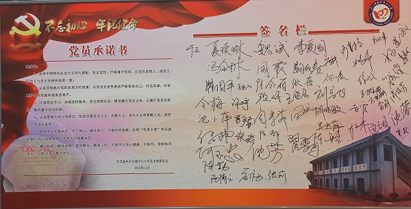在前期的主题教育中,每位党员都上交了个人承诺书,学校党总支结合党员个人承诺书内容,拟定了大浦中心小学全体党员公开承诺书,接受群众和社会的监督。在沈毅烈士塑像前,夏瑷琳宣读了公开承诺书内容,全体党员在承诺书宣传板上郑重签名,向社会亮出承诺,彰显党员先锋本色。