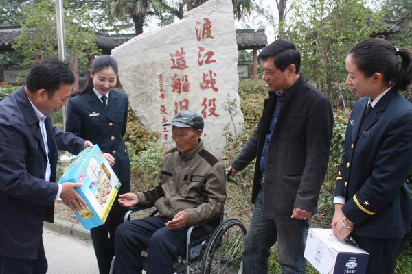 随后,徐进一行来到82岁老船工王来根家中。王来根参加过渡江战役造船,他向同学们讲述了当年粟裕将军在渔行地区召开动员大会,号召当地船工为解放军横渡大江日夜造船的场景。徐进对老船工当年的义举十分赞赏,对老人表示亲切的慰问。