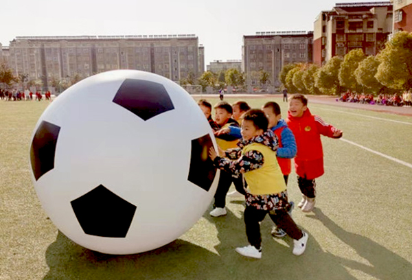 “爸爸”的比赛结束,孩子们上场了,一个巨无霸“足球”被孩子们推进足球场。孩子们小组合作,看哪组能把“足球”翻滚到对方的球门,即为获胜。孩子们高呼“翻滚吧,足球”,使出浑身气力推动足球翻滚,清脆欢快的笑声在球场回荡。