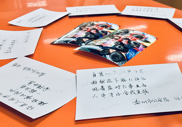 十年前,廖天一、解雯、徐梓唐、袁宇森、王砚钦、何思源、詹晓雯等11名少先队员把“平安果”送到送到汪涛和同事的手中。十年悄然而过,但当年的照片汪涛还保留着。今天他把照片都冲洗了出来,每张照片都写上不同内容的亲笔赠言,其中一幅照片的背面写着:“自信心下妙笔生花,好状态下能力挥洒,沉着应对万事俱备,人中才子舍我其谁!”。