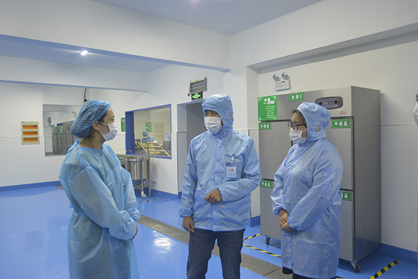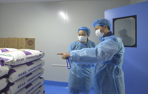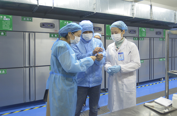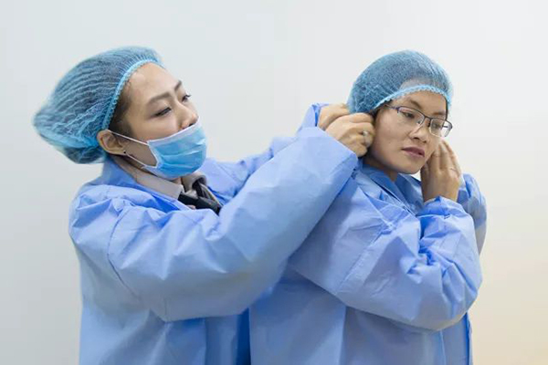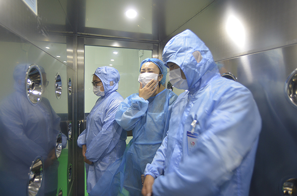 所有人员必须换上消毒衣,带上一次性口罩、头罩、鞋套,在感应水龙头前洗手、烘干、酒精消毒,通过风淋室方能进入各个生产区。