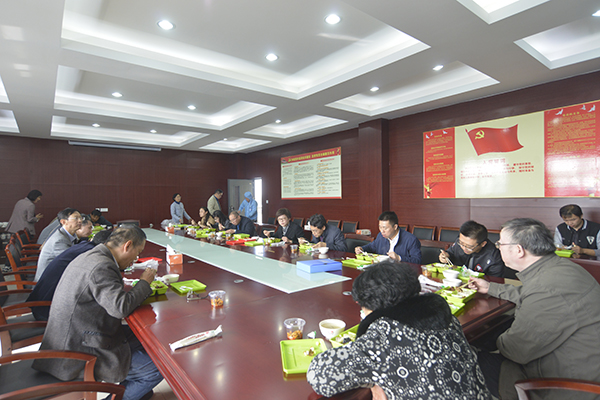 孙佳玲、凌华余以及其它学校前来察看的代表在试吃学生餐。孙佳玲对企业负责人说:“今天这个标准和服务希望永远保持不变。”