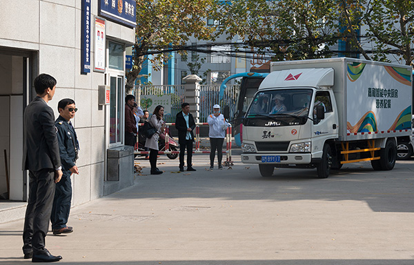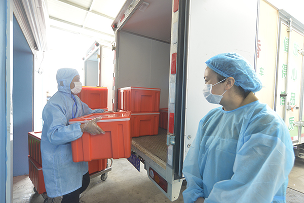 学生餐盒被装在双层保温的餐箱里。学生配餐装车完毕,企业工作人员给餐车扣上“封扣”,启程送往学校。