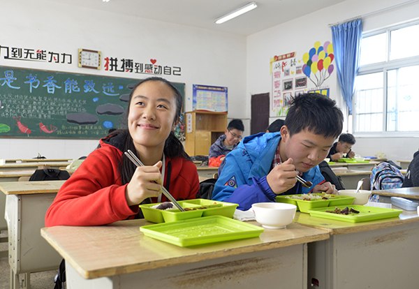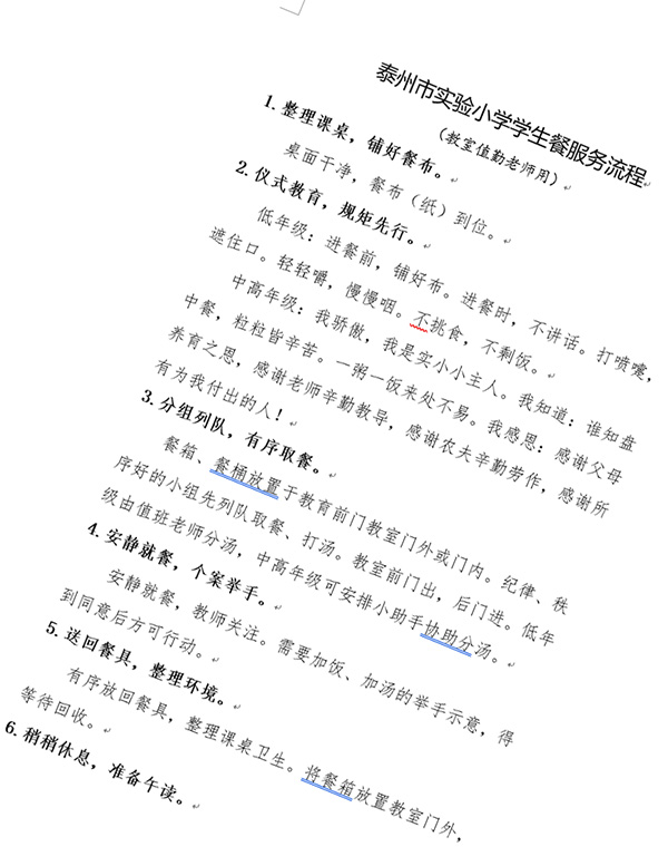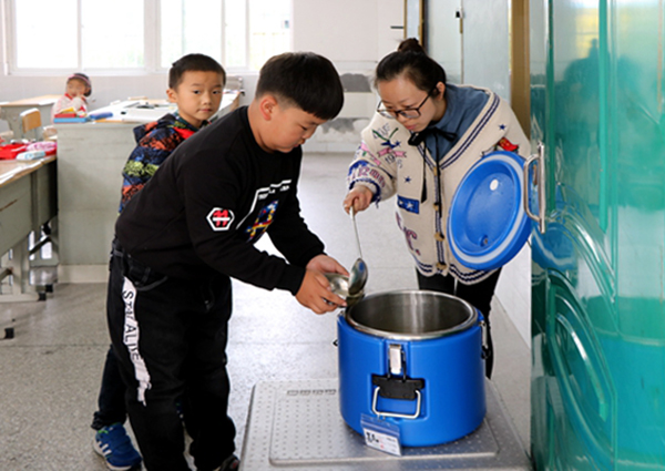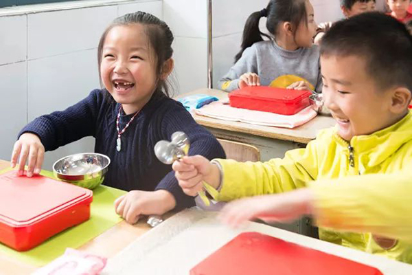 区教育局组织教师代表,家长代表到两家企业考察,多次召开学校负责人工作会议,对学生在校就餐的诸多细节做了多次会议提醒,多次到学校察看学生配餐的各项准备工作。学校根据教育局的要求制定了详细的实施方案,建立了食品安全管理制度和职能机构。小学生年龄小,工作人员送餐到班。实验小学的同学们进餐前宣誓:“进餐前,铺好布。进餐时,不说话。打喷嚏,遮住嘴。轻轻嚼,慢慢咽。不挑食,不剩饭。”实验小学校长丁正后说:“取餐,清理餐盘、桌面,打扫教室这些学生力所能及的事,可以培养学生的生活自理能力,培养学生作为班集体一员的责任感,学校要让就餐这件事能够发挥更多的教育功能。”