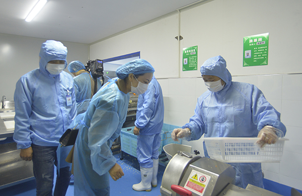 两位学生家长侯玉、冷亚萍分别跟踪两个摄制组全程查看两家企业学生配餐的进货、清洗、检验、加工、包装、配送的全部环节,下面我们就跟随两位家长一起走……