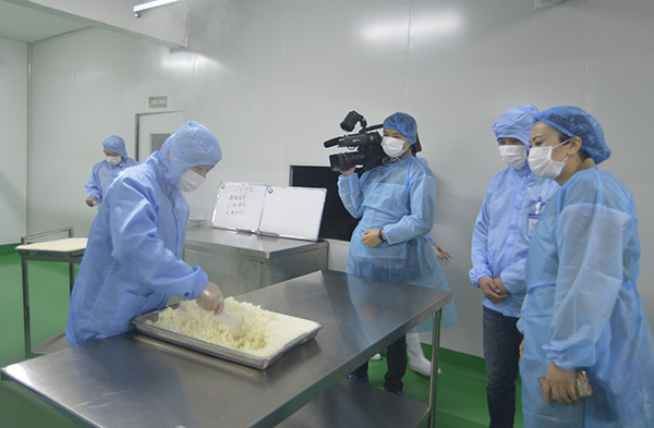 企业员工给出蒸箱的米饭“翻身”,让学生们吃起来口感更疏松。