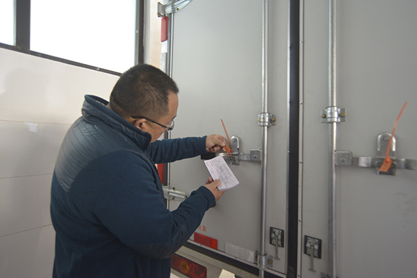 到达学校后,学校教师核查餐车“封扣”序号,确认送餐车沿途没有被打开过。