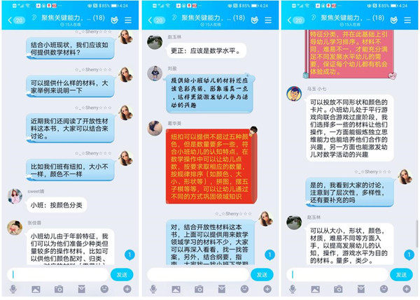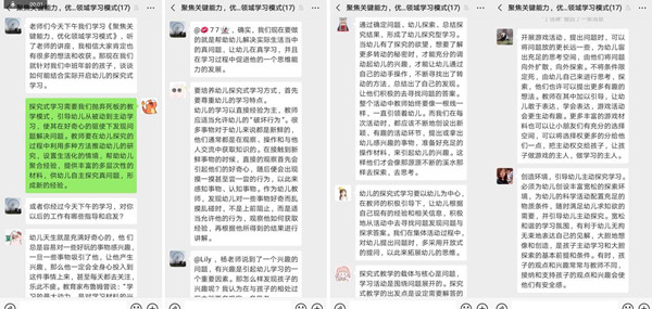 许有芳老师讲的是“如何优化数学领域学习模式”。她用生动的案例帮助老师们理解如何运用探究式的学习方法,让幼儿独立发现问题、实验操作、处理信息、获取知识,从而培养能力,发展情感。观看网课后,各年级组长确定了本组的研讨问题,通过网络平台开展研讨,分享研讨结果。