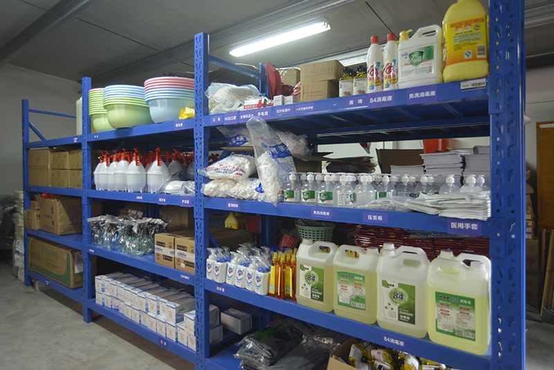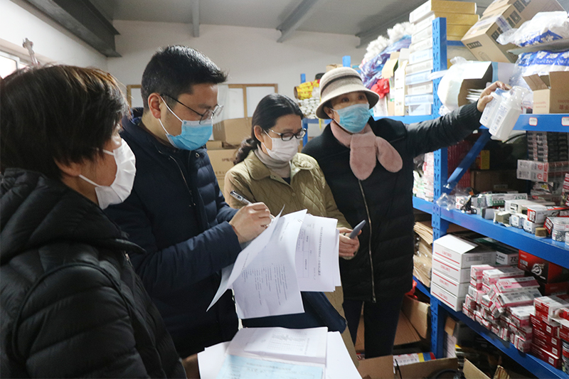海陵区教育局疫情防控工作小组成员在实验小学检查防疫物资储备