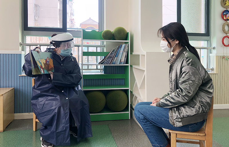 保健老师安抚“小阳”的情绪(为节省防护服,演练时老师用雨衣替代)