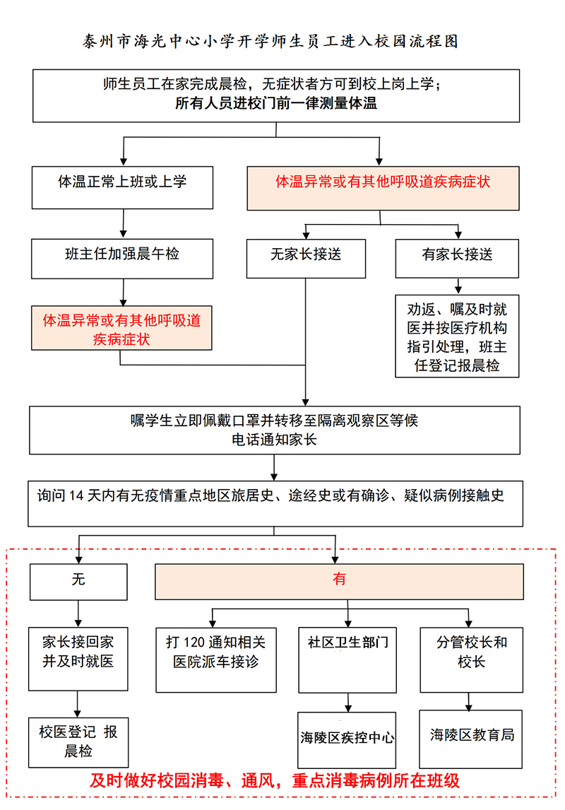 上面是泰州市海光中心小学开学预案中的第一条。海陵区委教育工委书记、区教育局局长姜小军在学校疫情防控工作会议上说:“从学生出现在校门的那一刻起,沿着怎样的路线进入班级,在哪些区域活动,如何就餐,洗手,乘车,老师如何检查等所有师生的行动轨迹我们都要掌握清楚,都要定时间、定岗位、定人员做好安全防护工作。各校一定要根据实际情况,拿出可操作的开学预案,做到‘一校一方案’‘一事一流程’,画出详细的学生进校路线图,确保开学后的教育教学工作、后勤保障、校园管理等安全有序运行。”海陵区各中小学、幼儿园按照区教育局疫情防控工作会议的要求,对开学预案充分思量,几易其稿。