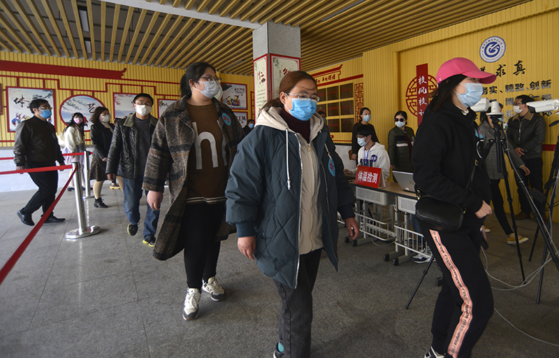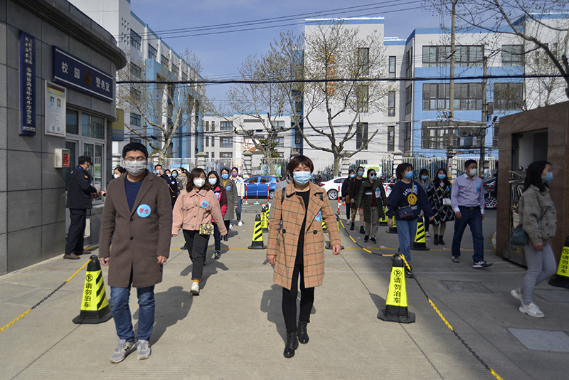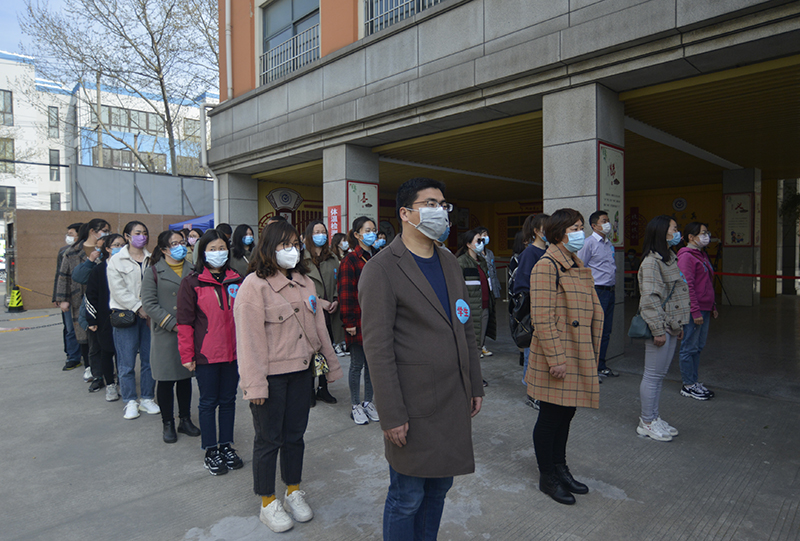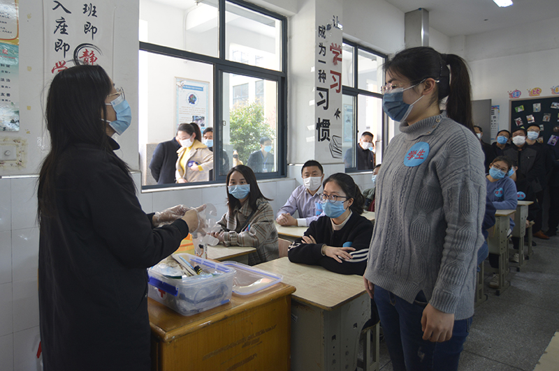 学生有序进入教学楼,然后在班级门口有序排队,学生进入教室后间隔就座。学校尽量利用教室空间,一人一座,同时要求学生在校上课期间全程佩戴口罩。