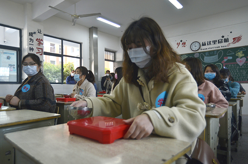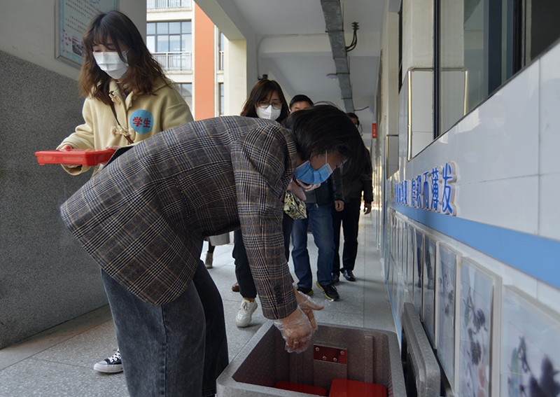 就餐时,配餐值班教师组织学生一列一列排队间隔1米取餐和盛汤,就餐结束后放回餐盒和汤碗,清洁餐具之后排队去操场活动。第一批次学生就餐结束后,将上午废弃的口罩丢入指定收集桶,保洁人员随即进行消毒。