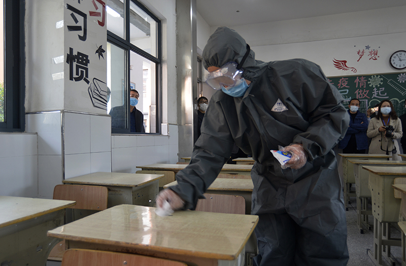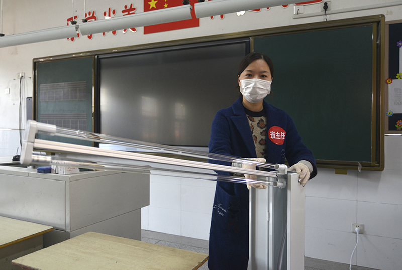 每天放学后,各班班主任使用学校配置好的消毒液对班级桌凳、教具、门把手、电梯等进行消毒。教室外,消毒人员利用喷雾式消毒机,对教学楼外部环境进行校园消杀。