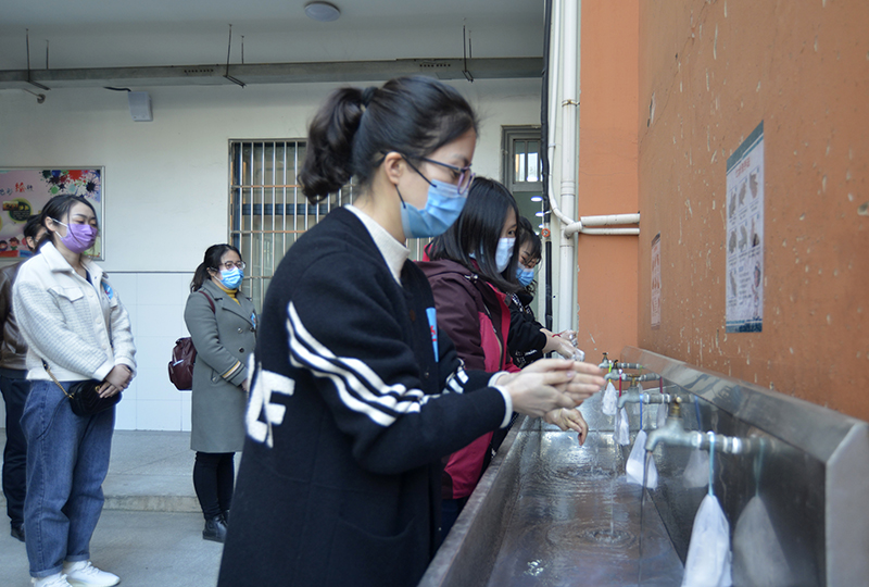 班主任先将单数组的同学带去操场活动,配餐教师有序组织双数组的同学排队洗手。课间休息和用餐前后,学生分批次(保持1米间距)按照规定路线去洗手。在值班老师的指引下,学生在洗手时互不拥挤,彼此保持“安全距离”。