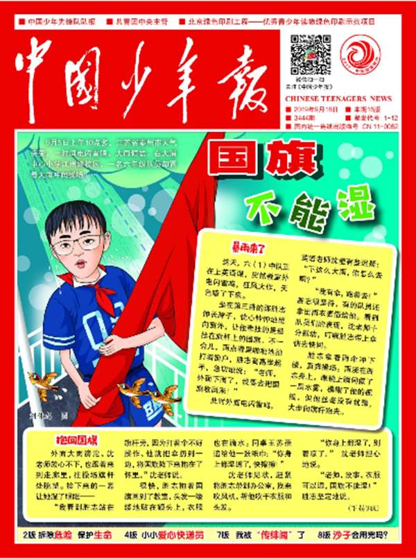 《中国少年报》头版报道大浦小学护旗手邵胜志同学冒雨收国旗网友纷纷点赞
