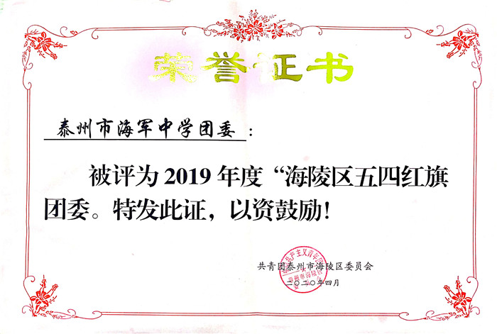 近日,从团区委传来喜讯,海军中学团委获评2019年度“海陵区五四红旗团委”荣誉称号,这是该年度海陵区教育系统唯一“五四红旗团委”荣誉称号获得者。