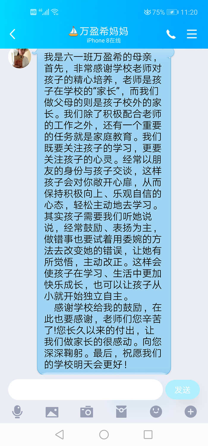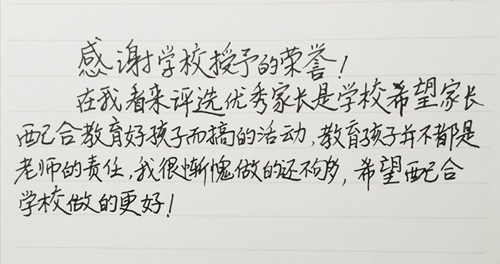 此项活动的开展,得到了全校家长的广泛关注和积极参与。三(2)班的学生家长刘科从儿子刘子凡手中接过荣誉证书时,心情无比激动,他说:“这是一份很有意义的荣誉,感谢学校领导和老师的肯定。各位老师用爱心和辛勤的汗水培养教育着每一位孩子,给他们鼓励和关爱,作为家长的我更应该积极配合学校完成各项育人工作。为了孩子的未来我要做一名更优秀的家长!”