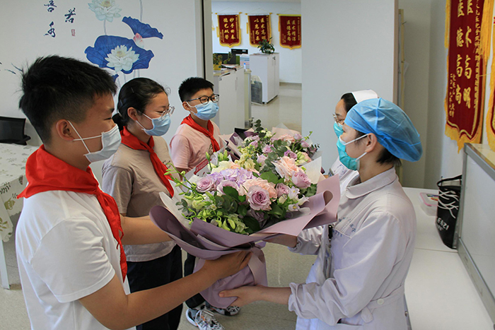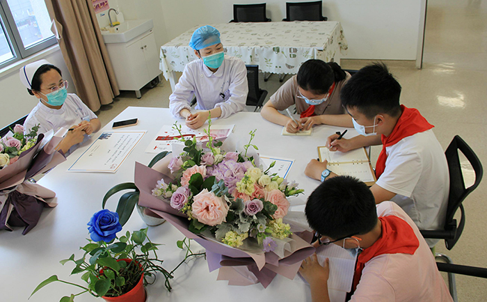 在泰州市人民医院,泰州二附中的三名队员一见邱玉玉、王晶,就给她们献花,行队礼,赠送知心卡,围成一圈听她们讲述抗疫故事。