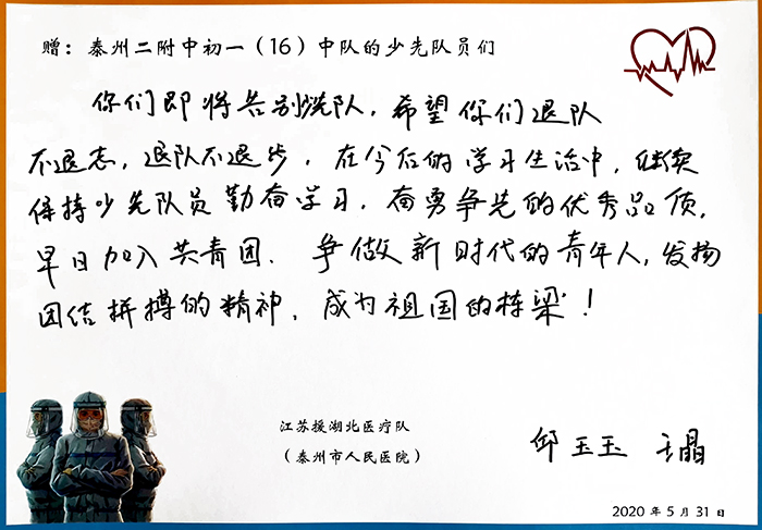 当队员们得知从接到通知到组队完成只用了50分钟时,都瞪大了眼睛,竖起了大拇指。队员们倾听她们到武汉的抗疫经历,你一言我一语地和她们聊驰援武汉的思想信念,探讨做好自我防护、宣传科学防治新冠肺炎、学好本领护佑人民健康等话题。丁思思告诉队员们:“当时她接到通知时是凌晨两点多,顾不上给父母打个电话,就赶紧收拾行囊前往湖北,到达以后才给家人打了电话说明了情况。队员们听了深受感动,朱洛渔说:“没有人生来勇敢,正因为被需要才选择了逆行而上。医护工作者的神圣职责,让他们成为平民英雄,成为是最美的逆行者!”临别时,邱玉玉和王晶为来访的队员欣然题写寄语,勉励他们勤奋学习,奋勇争先,早日加入共青团,成为祖国的栋梁。