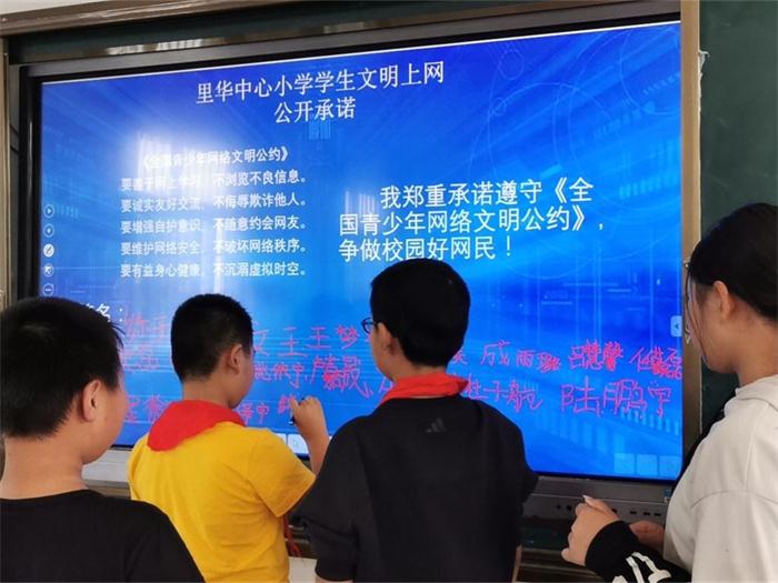 里华小学组织学生在文明上网公开承诺电子屏上签名