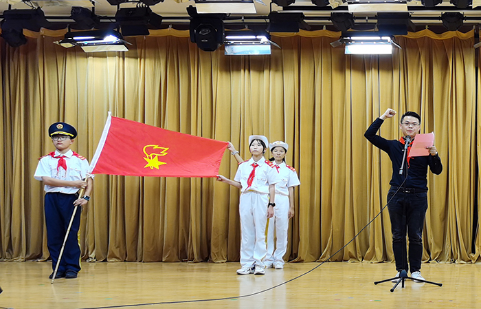 港口学校的少先队员佩戴上大红领巾向队旗宣誓