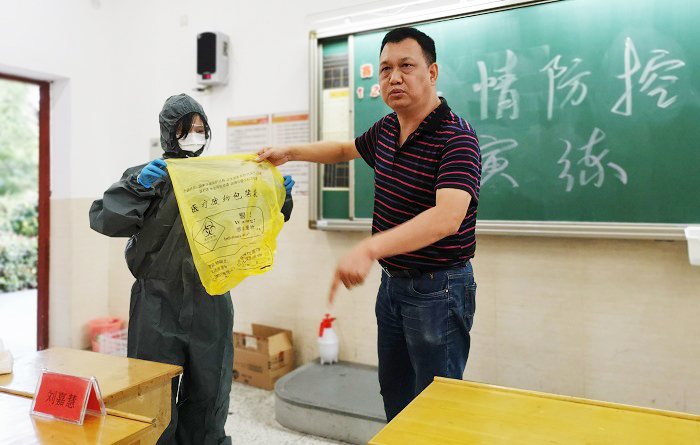 此次疫情演练安排了两个场景,一是学生发热不适,二是学生突然呕吐。两个场景中,班主任、当堂老师、其他老师、校医相互配合,积极处置。一方面为不适或呕吐学生反复测量体温,隔离观察,简单流调,联系家长送医。另一方面把班级的其他学生隔离到安全区域,按防疫程序的要求科学处理学生的呕吐物,开窗通风,对教室门窗、桌椅、地面等用消毒液、紫外线灯消毒,对被呕吐物污染的学生文具、课本、衣服等用塑料袋密封后再作处理。学生康复返校必须出具医院的相关证明。