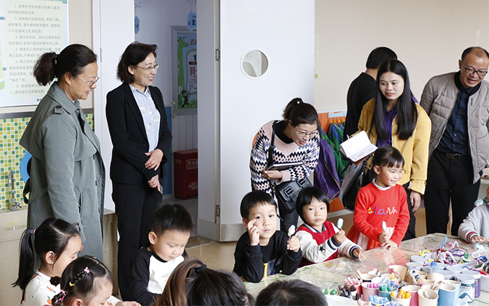 在易居城分园,李焜一行察看了幼儿园环境,特色活动室和孩子们的活动。和孩子们一起游戏,在互动中感受孩子们的纯真、快乐。双方还就环境创设、活动设计等进行了深入交流。