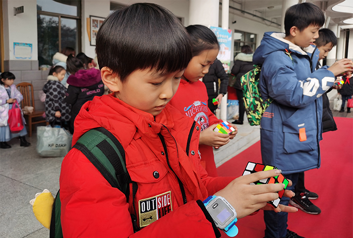 来自四年级(5)班的章早立在第一组魔方比赛中拿下第一名。章早立说,自己从小喜欢数学,学魔方已经两年了,这种游戏很考验手脑并用,目标是能拿全国冠军。