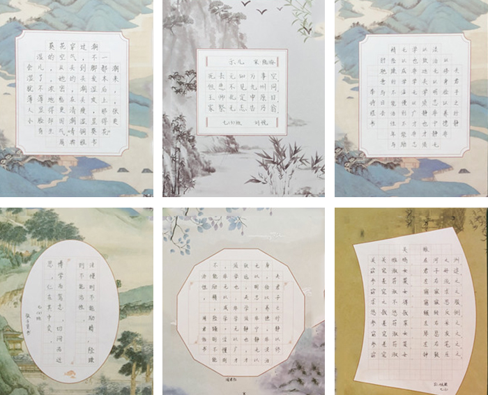 同学们书写的内容为语文课本中的《天上的街市》和《诫子书》两篇。横竖撇捺构成了方块字的奇妙组合,或结体遒劲,字字严谨;或翩若惊鸿,婉若游龙;或心摹手追,广采众长……每个字独有的风韵,似一朵朵在笔尖绽开的花朵,让人心怡。老师们爱不释手,把学生的书写作品装裱成圆形、扇形、矩形、椭圆形,镶嵌在古画之中,洋溢着浓浓的中国风。