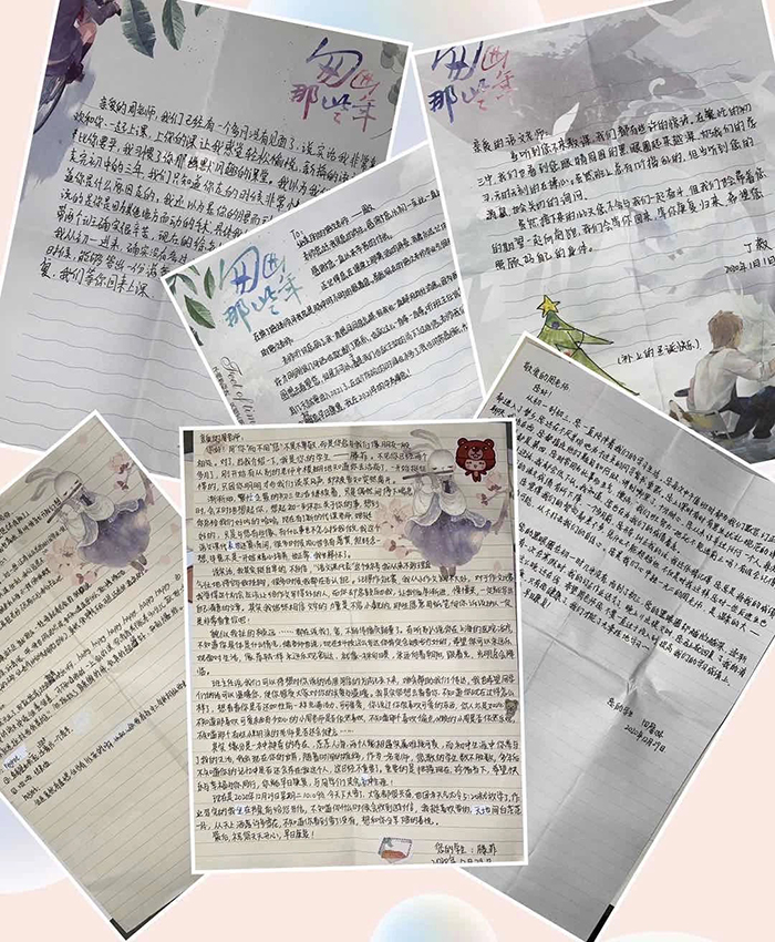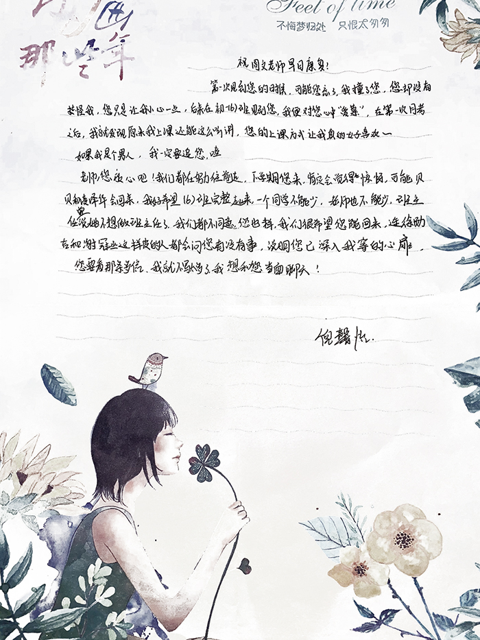 老实说您一个人带两个班确实很辛苦,我非常喜欢听您的课。在您的课上我是轻松愉悦的。我从初一进来,没有考过满意的分数,希望中考的时候,我能够交一份您满意的答卷,祝您早日康复,我们等您回来上课!(顾展鹏)