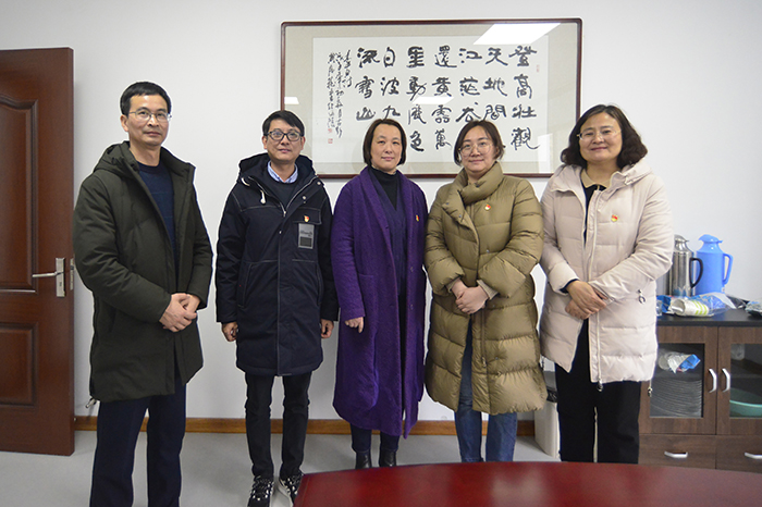 曹领娣(右)、海陵学校党支部书记王美华(左)与杨金宝、沈中健、翟丽丽合影