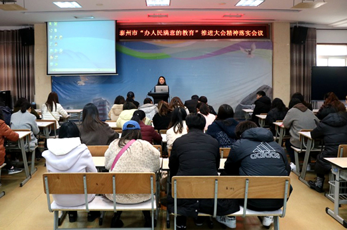 泰州市实验小学召开全体教师会议,进一步落实全市“办好人民满意的教育”推进会精神,重温了市委书记史立军关于办好人民满意教育的“暖心话”和推进教育优先优质发展的“动员令”。会议强调,要贯彻落实好推进会精神,积极推动教师成长发展,全校教师要切实担负起办好人民满意教育的责任与使命,提升“品质意识”“责任意识”“执行意识”“政治意识”。会议形成了多项举措: