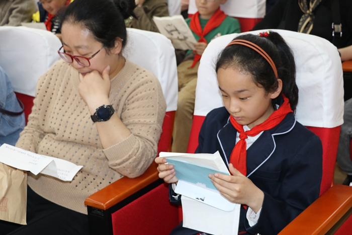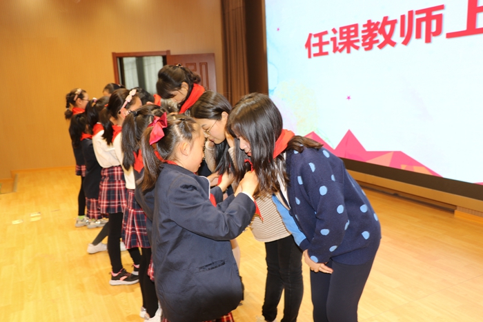 四年级任课教师集体登台,学生代表为老师们戴上红领巾,全体学生起立,向老师献上少先队员最崇高的队礼,感谢老师们的辛苦付出。四(2)班的同学带来了精心准备的朗诵《老师的眼睛》,表达了对老师的浓浓敬意。“成长,是春天的种子,承载了萌发的希望;是夏天的果实,收获着过去的时光;是秋天的落叶,凝成了高飞的翅膀;是冬天的花朵,积聚着不屈的力量。无问春夏,无问秋冬,祝福亲爱的孩子们,茁壮成长!”黄佳阳老师感动地说。