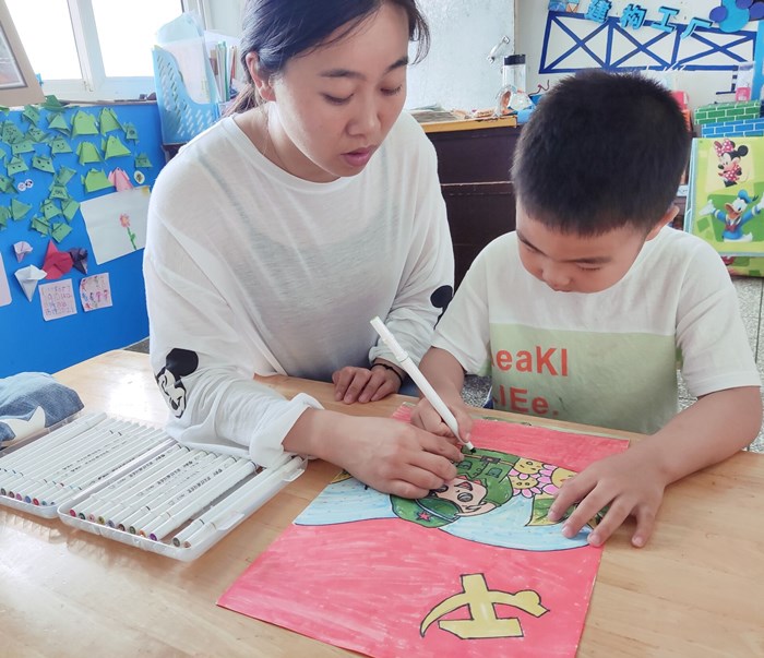 “我画的是这幅画!画的名字叫《我和党在一起》,画里面我站在天安门广场,向国旗致敬,这幅画是想表达我和我的祖国,一刻都不能分割!”吴欣悦小朋友骄傲地向小伙伴们介绍着自己的画作。