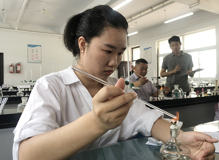 实验说课,教师自行准备课题,现场展示;初中生物实验让老师们观察石榴花及人体肾单位;化学操作实验安排了氢氧化钠和稀盐酸发生反应生成新物质、粗略测定稀盐酸的溶质质量分数、高锰酸钾制氧气三个实验。笔试题主要考查选手们的实验知识和对实验教学的认识态度。