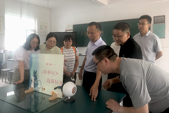 比赛结束后,参赛老师饶有兴趣地参观了九龙实验学校万小荣老师的科技工作室。工作室陈列着万小荣自制的《反射弧光纤电磁动态演示仪》《旋转视觉成像近视远视矫正演示仪》《特异性免疫动态演示仪》等省赛获奖教具,引起老师们的极大兴趣,他们纷纷向万小荣请教制作经验,使用方法等。