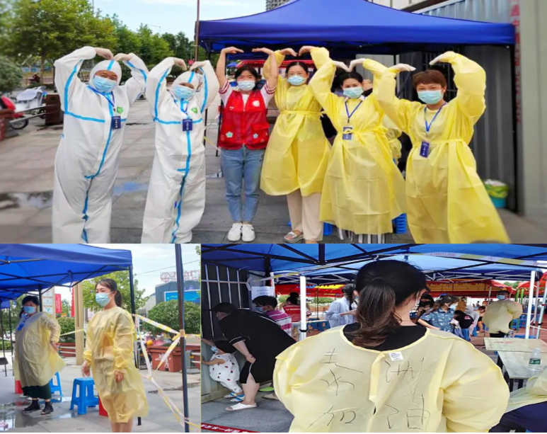 泰州西大门界沟桥防疫卡口与扬州交界,防控任务十分繁重。九龙实校的万小荣、李阳、杨凡老师参加了界沟卡口值班工作,他们穿着防护服,戴着口罩、橡胶手套,不停来回于前前后后的车辆,对人员体温、行程卡、苏康码进行严格检查,如果有从中高风险地区来的车辆,一律耐心劝返。换班时,脱下防护服的他们,手上全是被汗水浸泡得发白的皱褶,就连鞋子里也灌着汗。万小荣老师说:“虽然很累,但我心里踏实,我在为心中的信仰努力着!能参与一线抗疫工作,很自豪!”