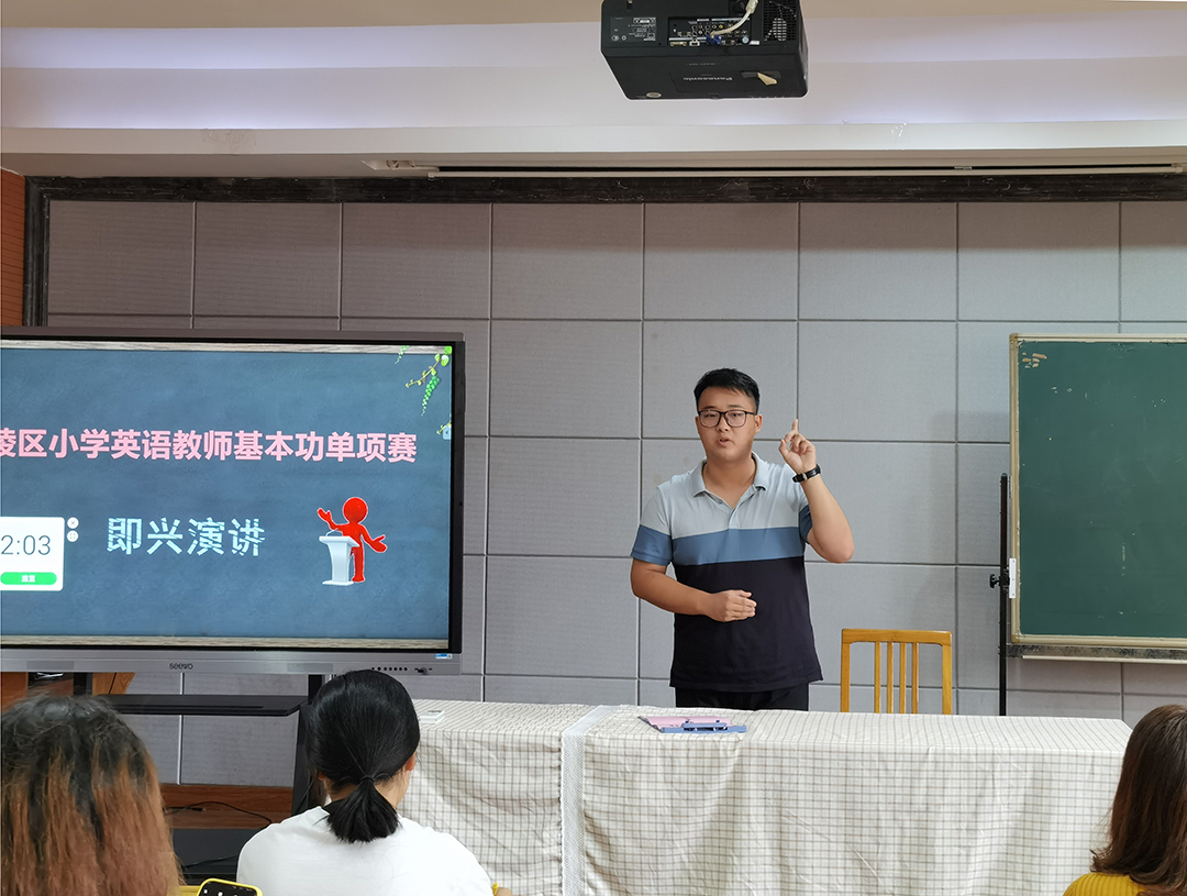 比赛共分为粉笔字、即兴演讲两项内容。在粉笔字项目,参赛教师现场拿到统一的书写内容,在规定时间内完成书写,旨在考验教师的教学基本功;在即兴演讲项目,选手们按照参赛顺序,现场拿到话题后准备三分钟,随即进行三分钟的英文演讲,旨在考验教师在语音语调、情感驾驭和临场构思方面的能力。参赛选手全力以赴,以认真的态度和饱满的热情展示了自我的优秀教学素养。
