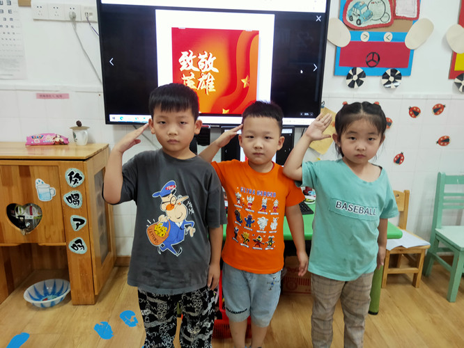 活动中,老师围绕幼儿的年龄特点和兴趣需要,从中国十大红色经典儿童电影入手,精选适宜的影片 《小兵张嘎》 《闪闪的红星》等,组织幼儿在班级进行观看。通过这些影片的播放,老师把形象直观、生动有趣的故事内容介绍给孩子们,小朋友们听得十分认真专注,他们被烈士身上不畏强权、积极斗争的精神深深折服。小朋友们还和老师一起起立、肃穆、默哀,再一次向革命烈士们致敬。