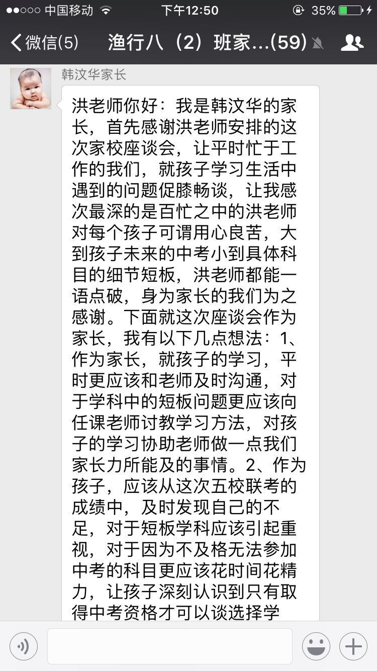 渔行实验学校实施“约谈”快一个学期了,这种新的家校沟通的方式受到家长们的欢迎。学生韩汶华的姨夫表示,学校安排这种面对面的“约谈”,大到孩子未来的中考,小到具体科目的细节短板,老师都能一语点破,身为家长,非常愿意到学校与老师见面,零距离交换意见,齐心协力一起为孩子的成长想招数。