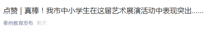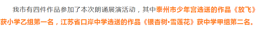 10月9日—10日,江苏省第七届中小学生艺术展演活动(朗诵专场)在泰州市第一外国语学校举行。泰州市共有4件作品参加展演,其中,我区少年宫选送的作品《放飞》获小学乙组第一名。