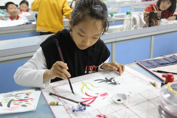 “老师,您来啦。”“老师,今天我们画什么呀?”……市少年宫国画专业的许莹老师刚刚走进社区课堂,孩子们就兴高采烈地讨论开来。“我们今天绘画的主题是:大眼睛,阔嘴巴,尾巴要比身体大,碧绿水草衬着它,好像一朵大红花。”上课伊始,许老师和孩子们玩起了猜谜游戏,让孩子们猜出这节课要学画金鱼,充分调动起他们的上课积极性。接着,许老师通过PPT展示、现场示范作画的方式,引导孩子们认识金鱼的形状特征、色彩变化,让孩子们直观有效地感受到国画用笔、用墨的方法。随后,在许老师的指导下,孩子们纷纷拿起画笔挥毫泼墨,他们充分发挥想象力和创造力,笔墨之间一条条金鱼跃然纸上,惟妙惟肖,活灵活现,栩栩如生。