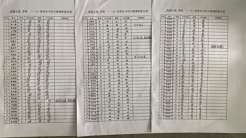 活动以东、西、北三个片区联动,各校教师推磨检查的形式举行。参与检查的教师从学生的读写坐姿、握笔姿势、书写质量三方面进行调研,并填写《学生书写习惯调研登记表》。调研过程中,教师们对学习习惯存在问题的同学都一一进行了耐心指导。