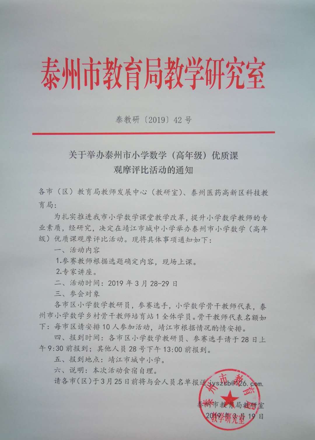 | 3月28日——29日 | 泰州市小学数学高年级 优质课评比活动(详见附件)点击下载 |
