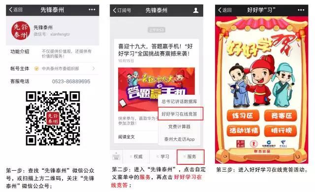 2.进入“先锋泰州”微信公众号,点击下方自定菜单中的“服务”,再点击“好好学习在线竞答”即可进入;